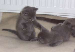 Jara was de eerste prinses die vertrok. Bij aankomst bleek dat er in het nieuwe huis nog een Blauwe Rus woonde. En niet zomaar een Blauwe Rus, maar Jimmy. Jimmy komt uit hetzelfde nestje als Ziggy (!), en daarbij hebben Jimmy en Zsa ZSa allebei dezelfde moeder. Je zou denken dat zoiets genoeg zou moeten zijn voor een warm onthaal, maar dat was dus even anders. Katten zijn daar toch wat minder emotioneel in dan mensen. Jimmy had eerder zoiets van: “Zo, een kitten op mijn territorium. Hoe lang denkt ze te blijven logeren?”. Het duurde even vooraleer het ijs gebroken was, maar uiteindelijk hebben ze elkaar toch in de armen gesloten. Jimmy is al een volwassen kater, dus bij momenten heeft hij even genoeg van het kinderachtige drukke gedrag van Jara, maar dat laat hij dan ook wel blijken.